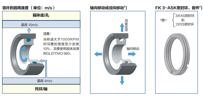 用于滾動(dòng)及滑動(dòng)軸承的油脂密封,如果抹上油脂,它能防止灰塵的侵入及環(huán)境濕度的影響。組合套件“FK 3-ASK”(增加溝槽底部的密封)由于迷宮的回路增加其密封效果也增加了。